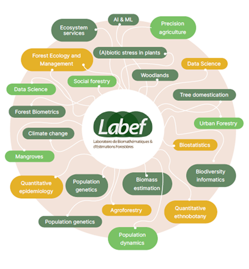 Nos recherches portent sur la biomathématiques et l’estimation forestière. Cela inclut la modélisation des systèmes écologiques, l’analyse des ressources génétiques forestières, l’économie forestière, les services écosystémiques et la biostatistique appliquée, notamment à la modélisation des maladies infectieuses et à la santé publique.